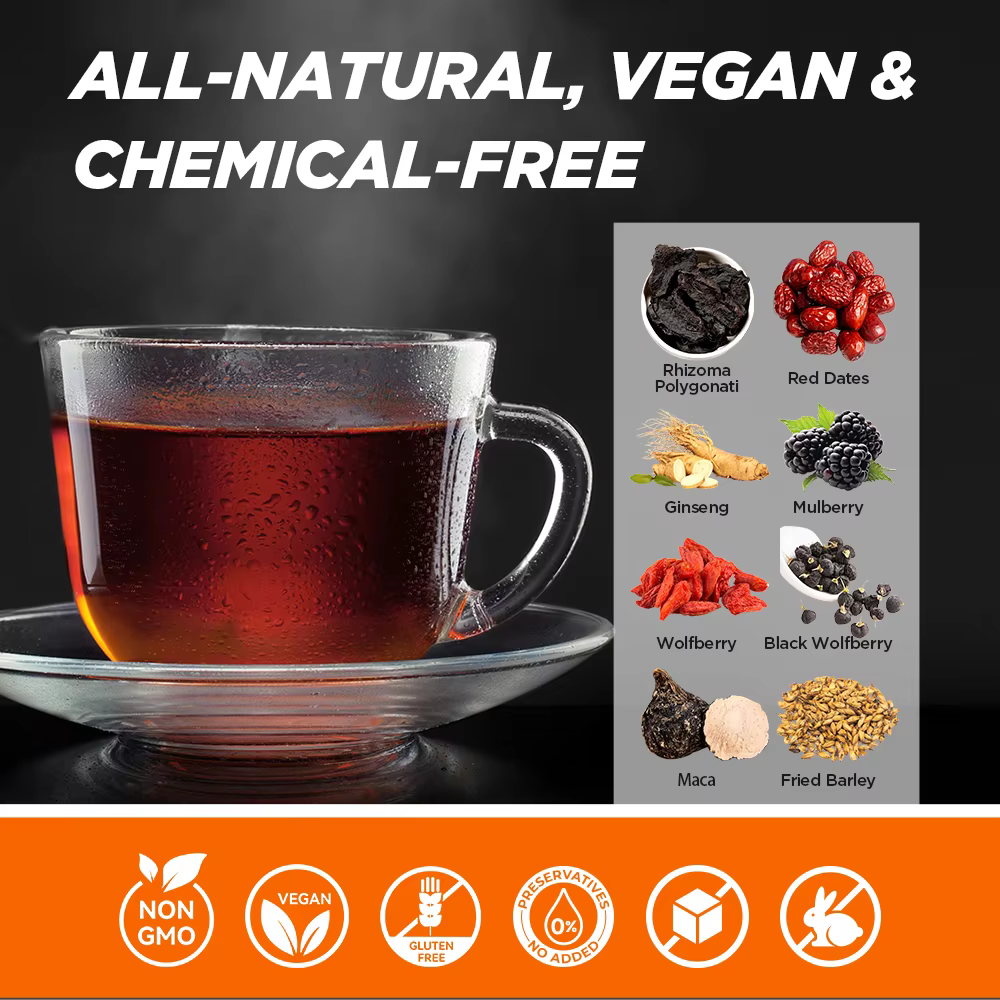 Ginseng Five Treasure Tea is built on this same time-tested wisdom. A potent fusion of 5 legendary herbs—Ginseng, Polygonatum, Goji Berry, Maca, and Black Goji— it’s designed to help men feel energized, confident, and in control.